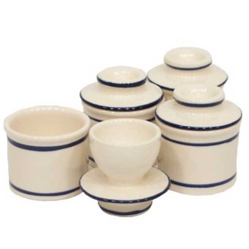 Each family member can have his or her own soft butter kept ready for daily use at the table with this set of four butter keepers. Each ceramic keeper features two parts: a base, into which cold water is poured; and a bell, into which softened butter is patted. When the bell is turned upside down in the base, the cold water creates a seal that prevents air from reaching the butter and souring it. No refrigeration is required. Cream-colored with a navy blue stripe accent, each butter keeper measures 2-1/2 by 2 inches and is dishwasher-safe.